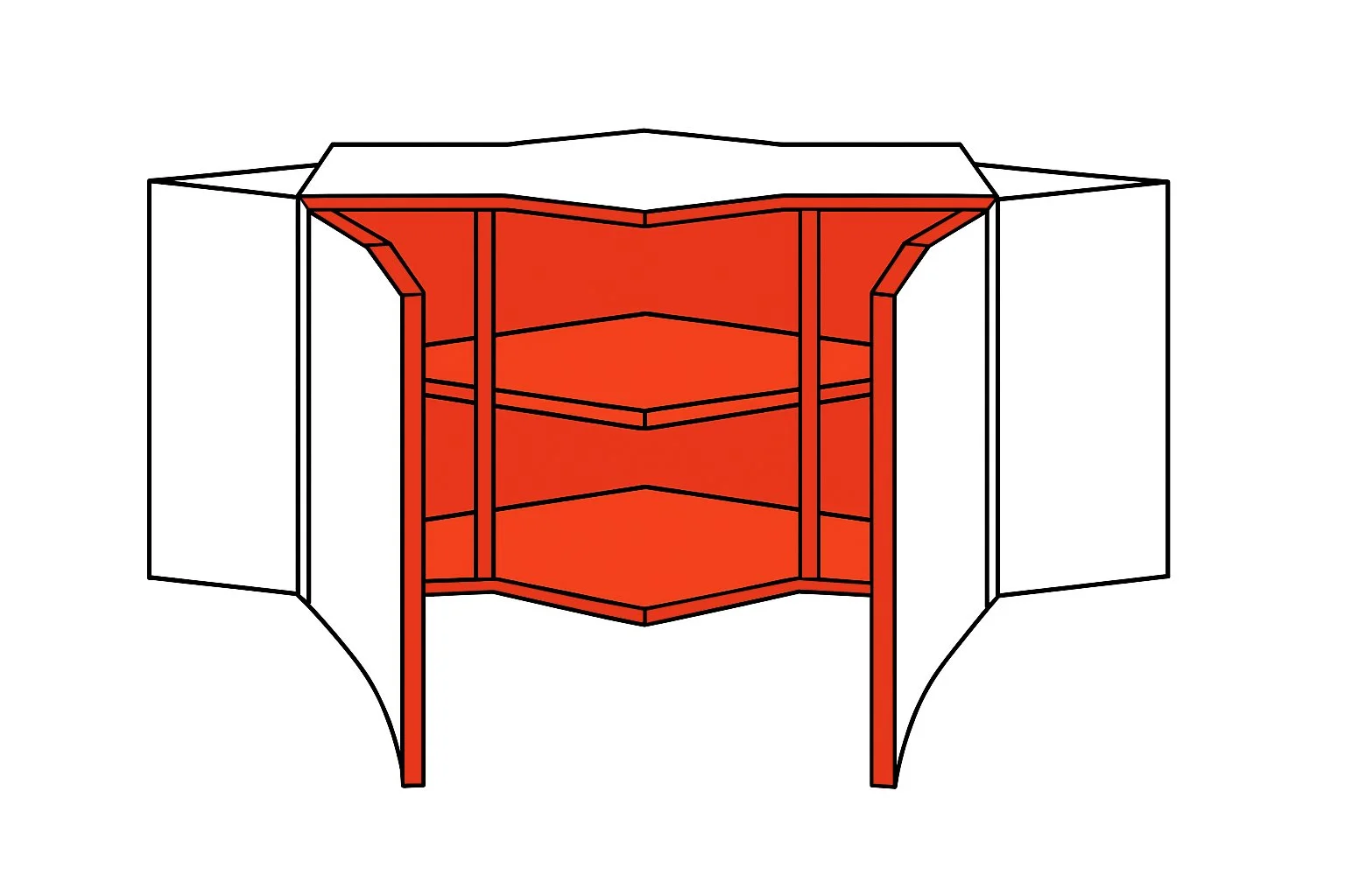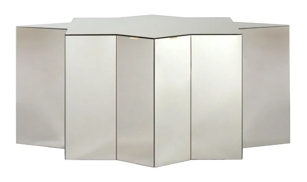 Portal is a collection of furniture conceived as a threshold — gateways into deeper presence and elemental truth. Inspired by the concept of contemporary altars, the pieces blend art, mathematics, and spirituality. The series comprises the Portal Cabinet I and the Portal Highboard, both designed in an elongated star shape. Surrounded by mirrored surfaces, the objects appear almost dematerialized, merging seamlessly with their environment. In contrast, the tactile interior, crafted from lacquered Valchromat in four different colors, offers a rich, sensory counterpoint to the luminous exterior. Both pieces are produced as part of a limited, numbered edition.
